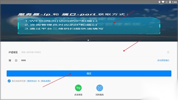 扫码后输入服务器IP,点击确定提交即可完成账号注册,服务器IP可向管理员咨询获取。