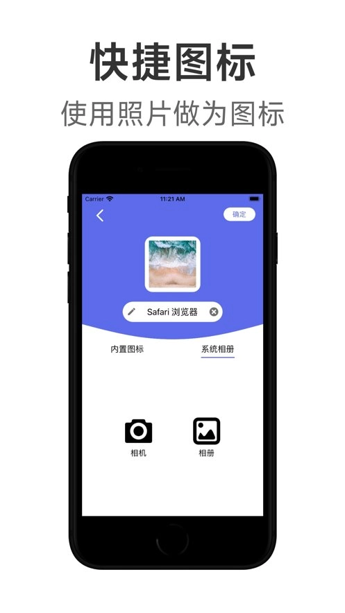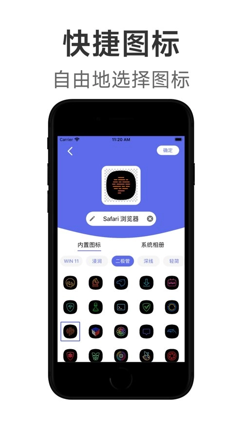 3. 从图标库中挑选一个图标,也可以从相机拍摄或相册里选取一张图片来作为应用图标,选好后点击确认按钮。