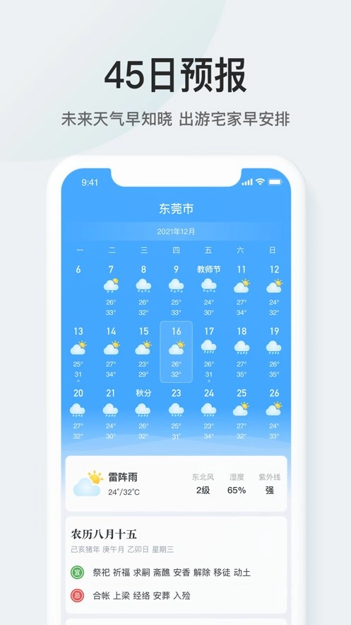 特点三:未来24小时、一周、十五天乃至45天的天气预报,搭配降水概率、空气质量、PM2.5、污染指数、风力指数等多元信息,全方位为您的日常生活保驾护航!