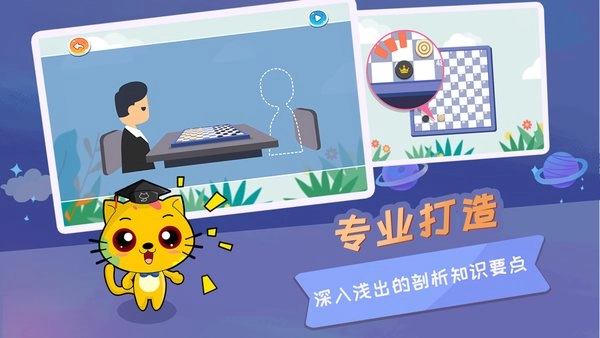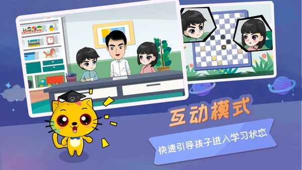 教学内容通过人物互动的形式展开,生活化的对话搭配动画的呈现方式,亲切自然,让抽象枯燥的国际跳棋知识潜移默化地被孩子轻松接受与理解。