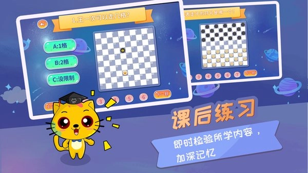 每节课结束时,我们会借助儿歌总结的形式,帮助孩子轻松有趣地记住课程重点;同时搭配课后练习,让他们对所学知识进行复习与巩固。此外,还设有国际跳棋人机对弈功能,供孩子实践运用所学内容。