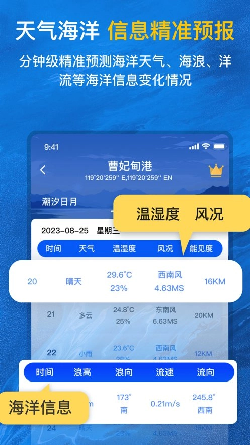 为海钓、赶海、冲浪、帆船等爱好者以及海洋捕捞等专业人员打造的潮汐时间表,它不仅可查询国内港口的潮汐、天气预报、日出日落等信息,还具备查看全球潮汐情况的专业功能。