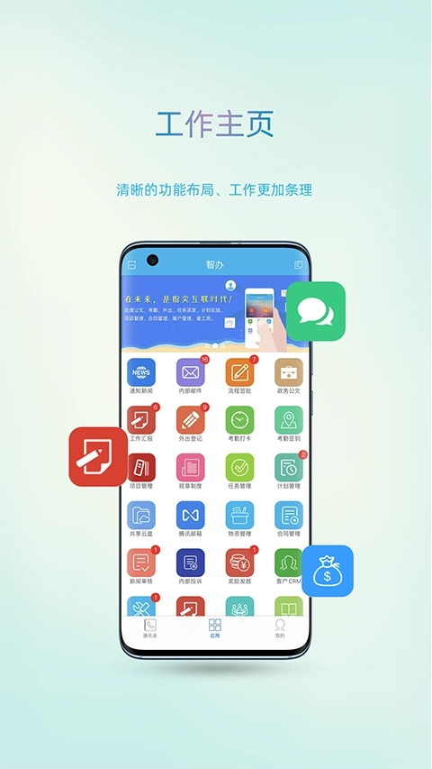 3、交互界面清新便捷。智办的交互界面采用清新淡雅的设计风格,功能划分清晰合理,整体操作体验方便快捷,让用户使用起来更简单、便捷且实用。