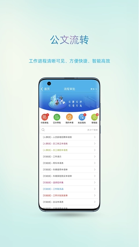 2、能够达成移动端实时审批流程,所有工作表单均支持通过手机进行填写、提交以及审核操作