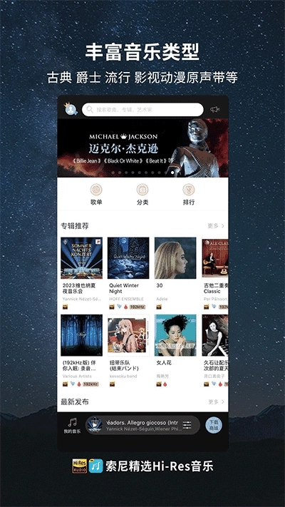 索尼精选Hi-Res音乐免费版是索尼打造的高品质音乐应用,平台汇聚了超10万首Hi-Res高解析度音频作品,作为国内头部的Hi-Res音乐服务平台,始终专注于传递高保真音乐体验。借助专业的音乐搜索系统,用户可通过歌曲、专辑或艺术家等维度快速检索,轻松找到喜爱的曲目,助力广大音乐爱好者更真切地领略Hi-Res音频的细腻质感与真实还原,全方位升级听觉体验。