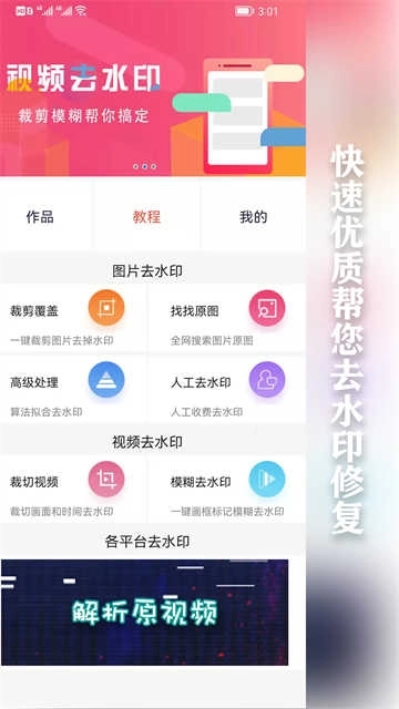 快去水印是一款专门用于消除图片与视频水印的软件。它具备简洁友好的操作界面,能让用户便捷地导入带水印的媒体文件,借助智能算法精准识别并快速去除水印,同时不会对原始内容的画质或画质造成损害。而且,该软件支持批量操作,用户可一次性处理多个图片或视频文件,大幅提升处理效率。除了核心的去水印功能外,快去水印还配备了图片编辑和视频剪辑的基础工具,比如裁剪、旋转、调节亮度与对比度等,能满足用户对媒体文件的日常基础编辑需求!