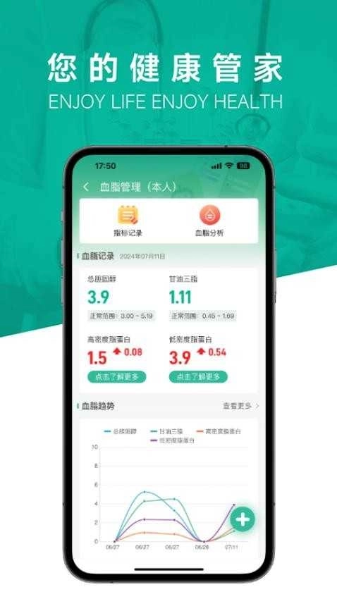 用户还能够查看自身的血脂数据分析,了解自己的血脂变化趋势。