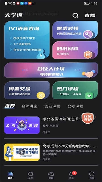 大学通是一款面向大学生群体打造的综合服务平台应用。该应用整合了课程表管理、成绩查询、校园资讯、图书馆资源、校园卡服务等丰富功能,助力学生更高效地统筹学习与生活事务。同时,它支持校园活动报名和社团交流功能,能有效增进学生之间的互动与协作。不仅如此,大学通还提供职业规划、就业指导等相关资源,帮助学生合理规划未来的职业发展路径,有需要的同学不妨尽快体验一下!
