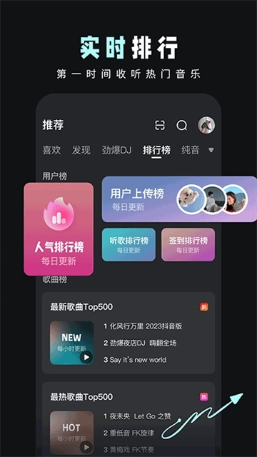 2、实时歌曲排行,第一时间听到最IN的音乐。