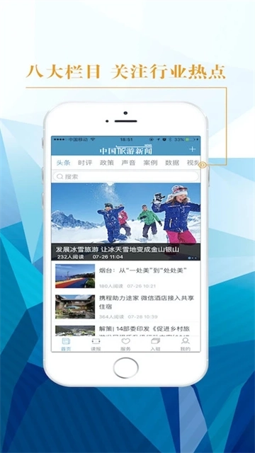 1、专注为旅游业管理者、从业者提供专业、权威、实用的深度旅游信息产品及服务,包含头条、声音、政策、案例、时评、数据、视频、直播八大栏目,以及入驻、超市、互动、读报四大功能。