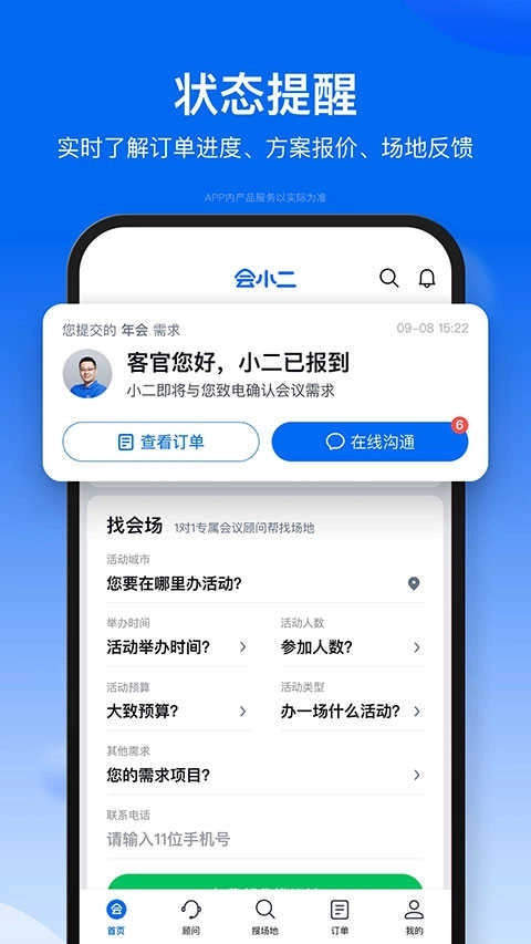 5只需5秒提交会议需求,10分钟内专属顾问就会主动致电沟通,28分钟内即可收到多套定制化会场方案,极大缩短了传统会议场地比选的周期。