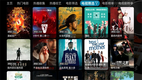 打开软件主页后,点击顶部的电视筛选选项,即可进入电视筛选页面。