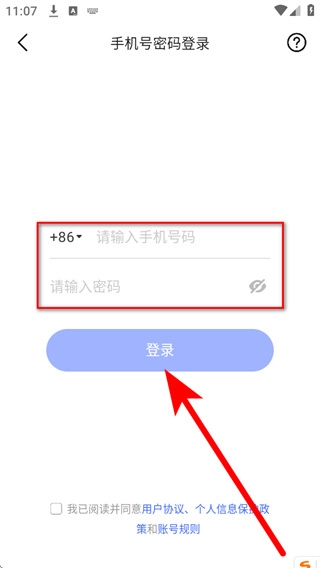 在手机密码登录界面,按顺序输入账号和密码,勾选对应的协议条款后,点击登录按钮即可完成账号登录操作。