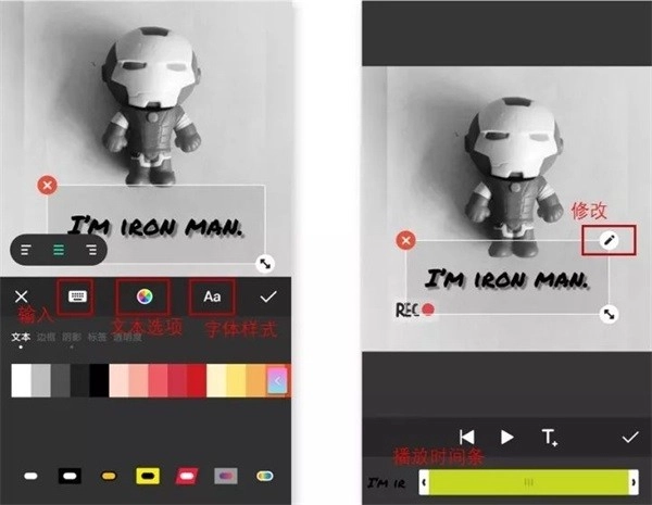 如左图所示,在「文本选项」里,能够调整文本的颜色、边框、阴影、标签等设置,点击「打钩」图标就能完成操作。而修改字幕的大小、位置以及播放时长,其操作方式与修改贴纸是一致的。