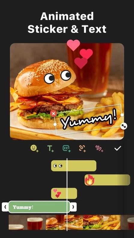 如右图所示,在「播放时间条」上用双指进行开合操作,就能缩放贴纸的整体播放时长,操作完成后点击对勾确认即可。