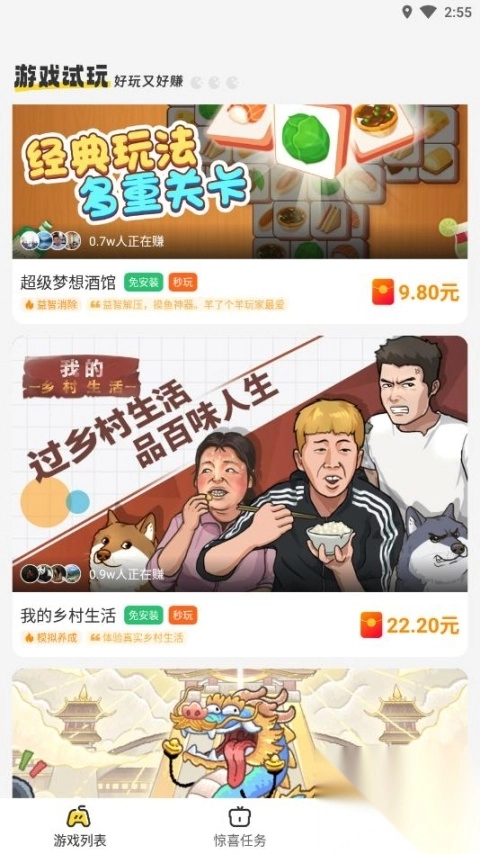 玩转空间凭借丰富的游戏资源与新颖的赚钱模式,成功吸引了大量用户的关注。平台界面简洁友好、操作流畅,使玩家能快速上手并沉浸其中。游戏种类丰富多样,可满足不同人群的娱乐需求,试玩赚钱的设定更是极大激发了用户的参与热情。