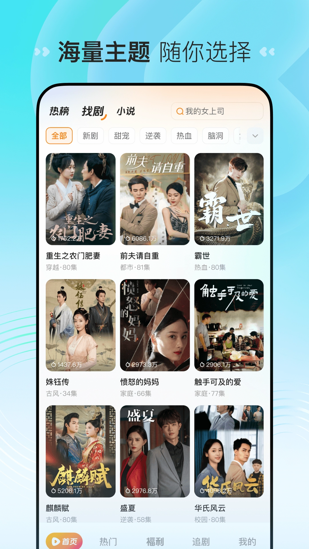 甜宠、逆袭、都市、热血,海量短剧,应有尽有。