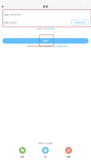 3、在登录页面,可输入手机号与验证码进行登录,也能选择微信、QQ、微博等第三方登录方式,点击【登录】按钮即可完成账号登录操作。