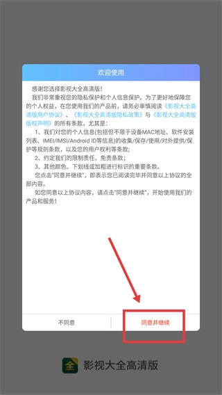 进入应用后,仔细阅读用户协议内容,然后点击【同意并继续】按钮,以此完成协议确认环节。