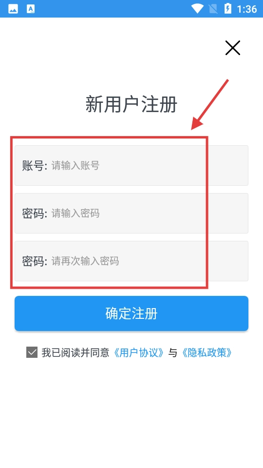 4、填写账号、设置密码并再次确认密码后点击【确定注册】,完成账号注册。