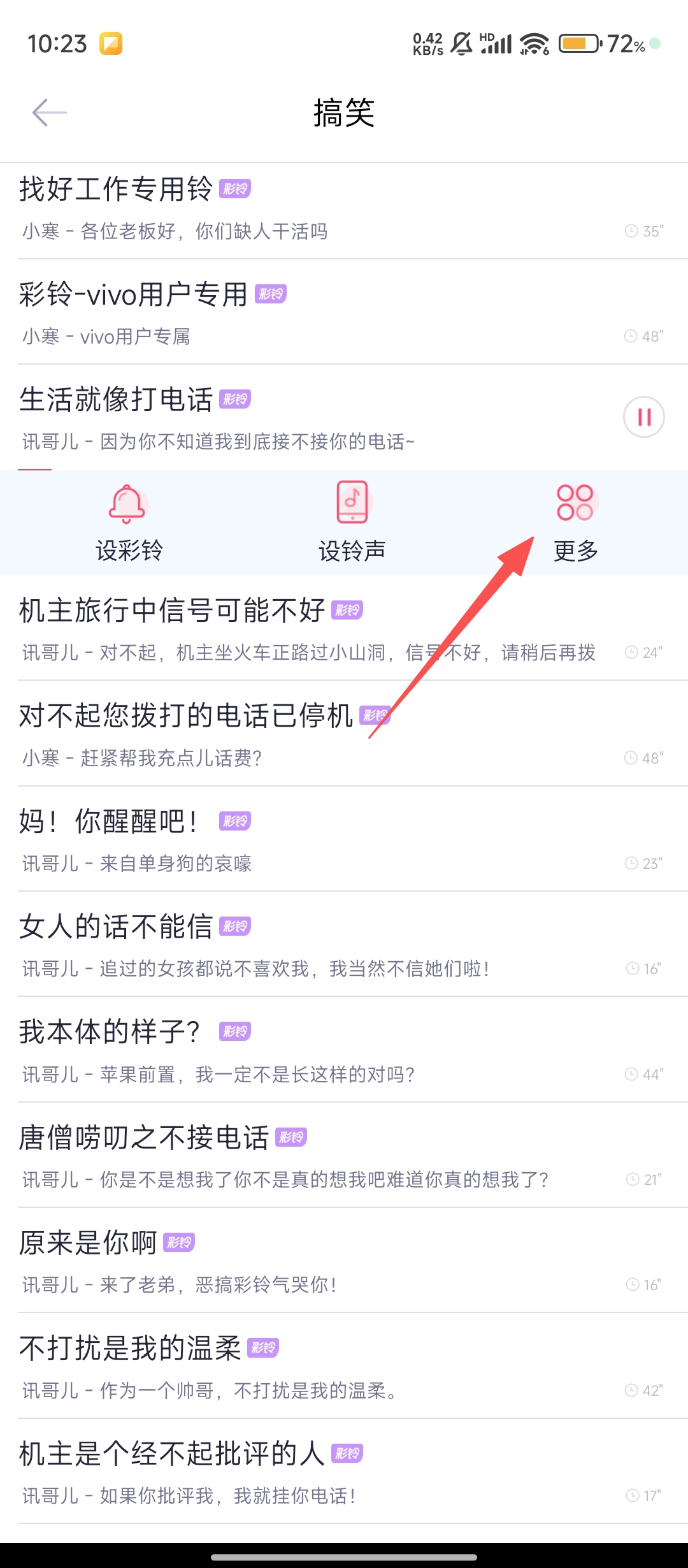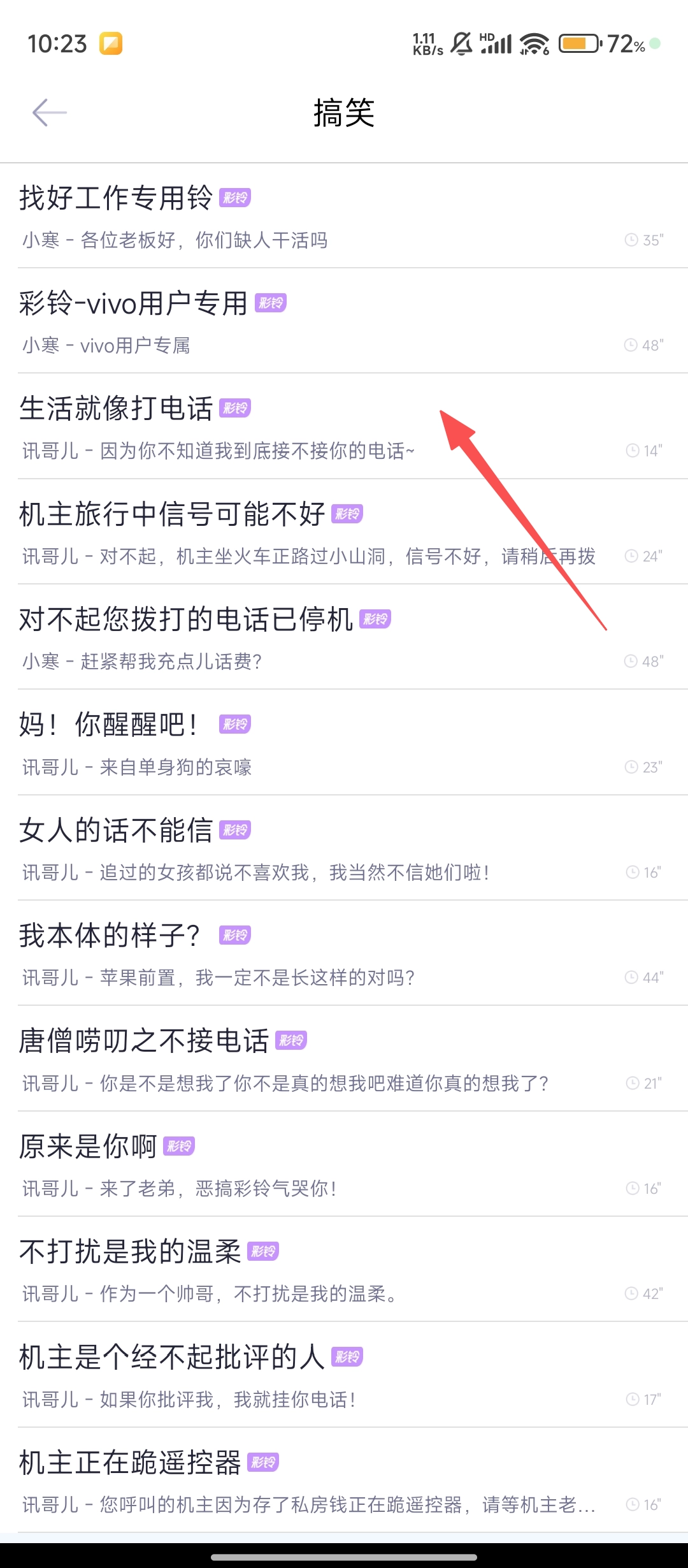 2、在搞笑铃声列表中,找到你喜欢的铃声并点击,就能进入该铃声的操作界面啦。