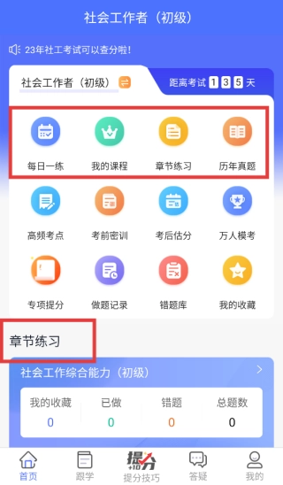 3、进入【社会工作者】学习界面后,可借助【每日一练】【我的课程】【章节练习】【历年真题】等功能开展学习活动,比如点击【章节练习】,就能按章节对知识进行巩固。
