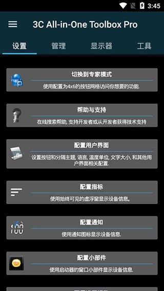 安卓调谐器,又名3CAll-in-OneToolbox,是一款功能强大的安卓系统优化工具。它界面清爽简洁,集成了电量显示器小部件、系统调整、多任务切换小部件等多种实用功能。用户可通过安卓调谐器设置自动终止应用程序的分类与触发条件,从而更好地管理和优化手机性能。不仅如此,这款软件还提供了全面的功能集合,能让用户详细了解并优化手机的性能与状态。