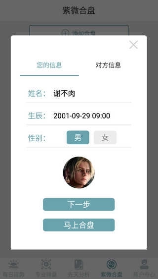 用户只需输入姓名与出生日期这两项个人信息,就能获取到对应的个人命盘信息。