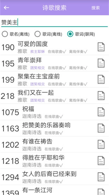 在线搜索歌曲时,您只需输入歌名或诗集名称,就能找到对应的歌曲。