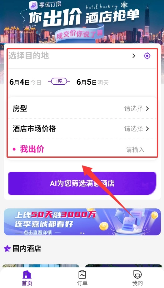 进入首页后,填写目的地、入住日期以及房型偏好等信息,系统就会智能推荐符合要求的酒店选项。