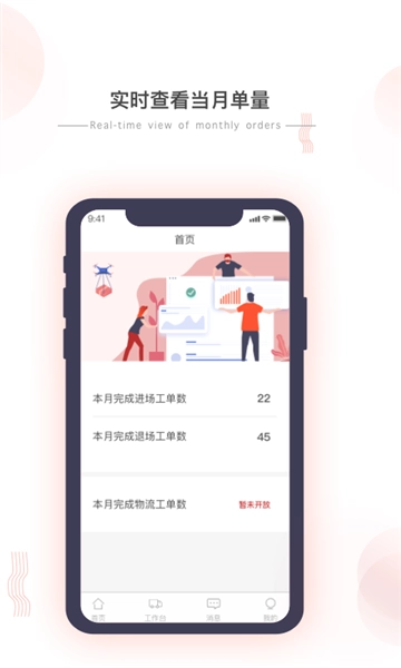 在小宏人司机版的订单管理功能中,司机能够清晰查看当月已完成的进场及退场工单数量,便于进行统计与管理工作。