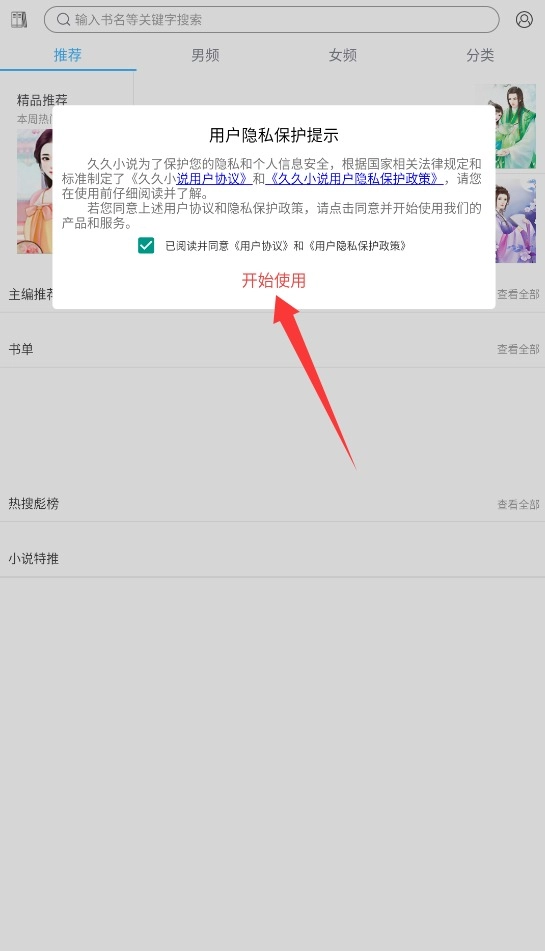 第一次打开久久小说应用时,需要先勾选同意用户协议和隐私政策,再点击“开始使用”按钮,这样就能进入应用的主界面了。