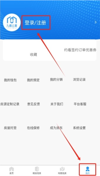 启动九阁公寓应用后,在界面底部找到“我的”入口,进入该页面即可看到登录选项。