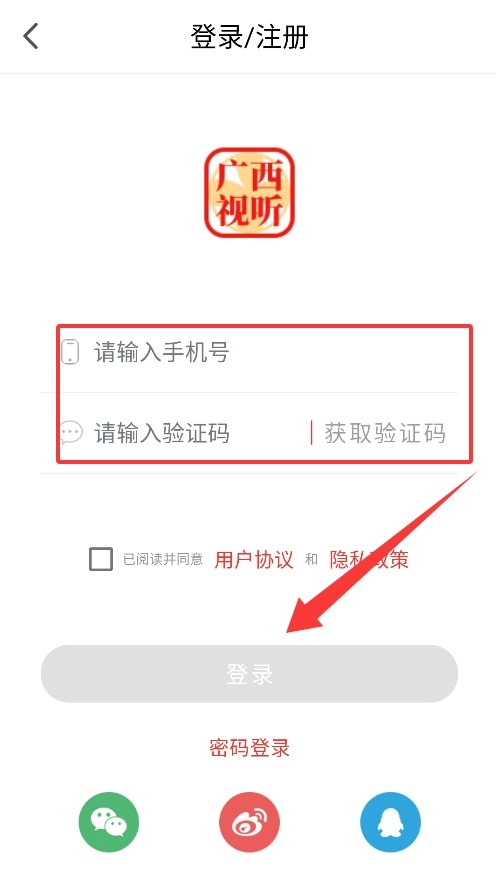 打开广西视听后,进入登录界面,可通过输入手机号并获取验证码来完成登录,也能选择微信、QQ等快捷登录方式。