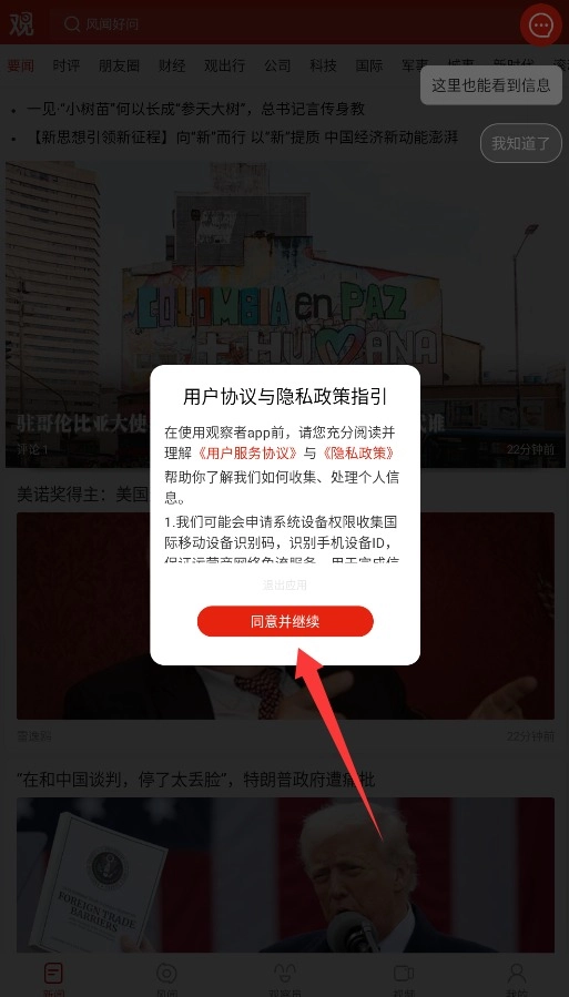 当你第一次打开这个观察类应用时,系统会弹出用户服务协议和隐私政策的相关内容。你需要认真阅读这些条款,之后点击“同意并继续”按钮,这样就能进入应用开始使用了。