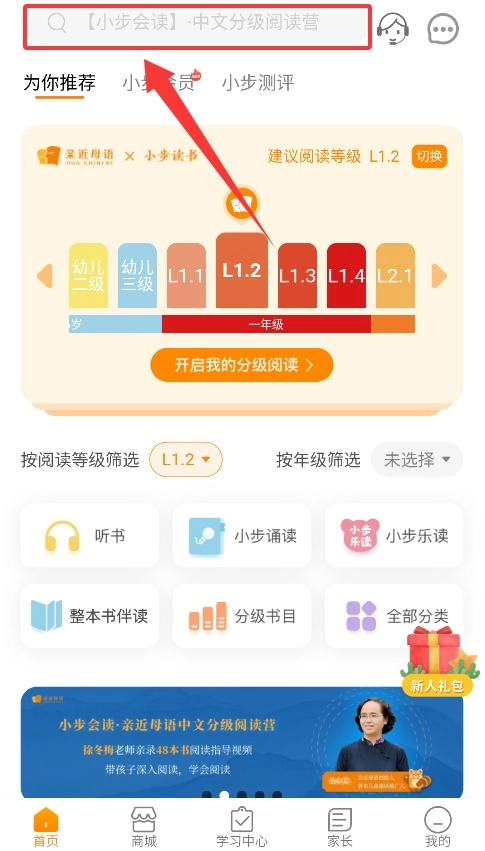 进入首页后,点击顶部的搜索栏并输入关键词,就能便捷地找到需要的母语学习资料。