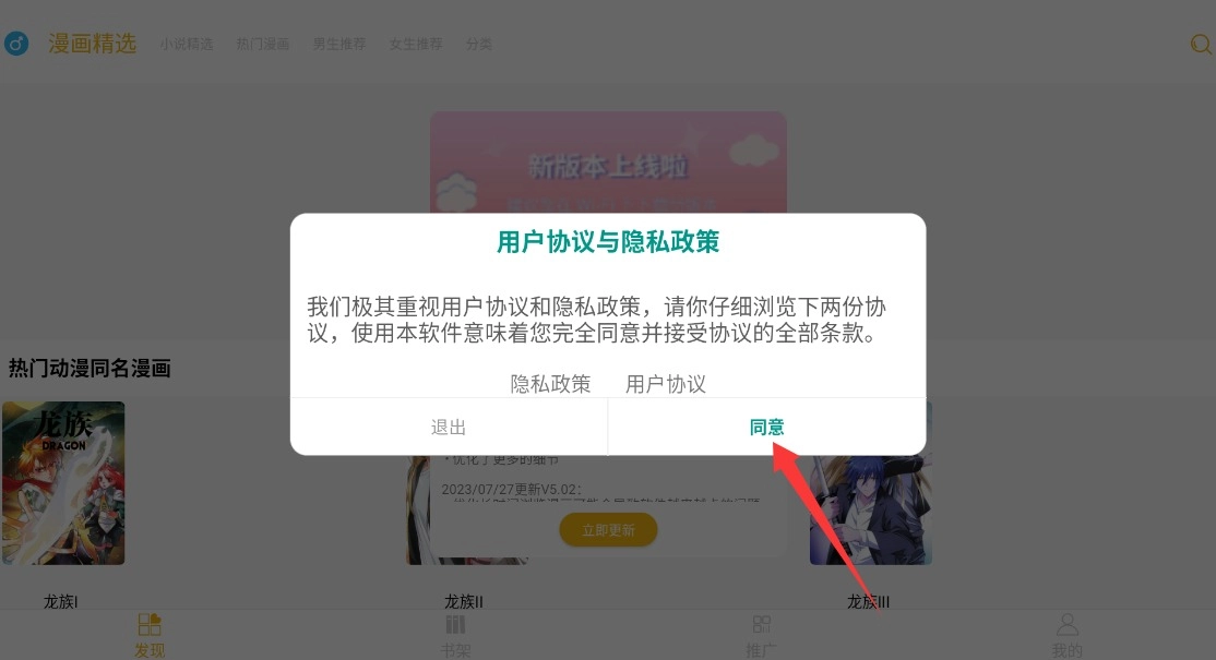 当你第一次打开漫画亭应用时,系统会弹出用户协议和隐私政策的提示窗口。你需要认真阅读这些条款内容,确认无误后点击界面上的“同意”选项,这样就能顺利进入应用的主页面开始使用了。