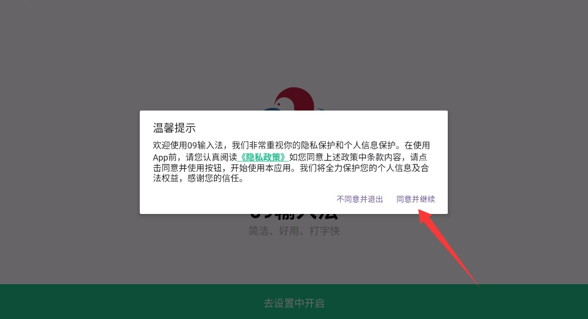 安装完成后第一次打开09输入法时,请认真阅读隐私政策,确认无误后点击“同意并继续”按钮,即可进入主界面。