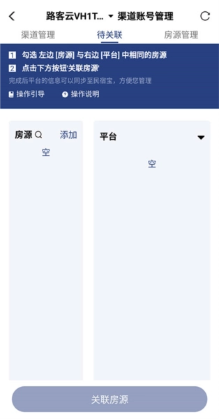 入驻第三步为【关联房源】,需勾选平台房源与路客云App上的相同房源,完成关联操作。