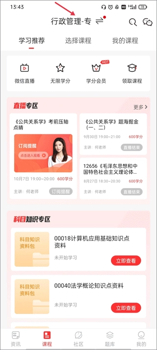 1、您可在【我的】里的学习中心,查看个人学分,这些学分可用来兑换对应的课程及考试资料。