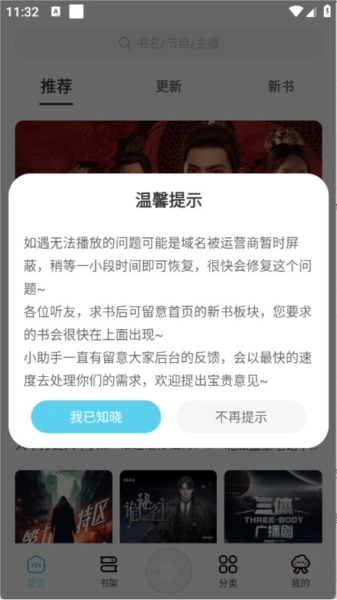 打开海云听书,点击“我已知晓”开启听书之旅