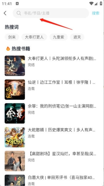 在应用首页上方的搜索栏里填入希望收听的小说名或作者资料,平台会马上呈现对应的搜索结果清单。