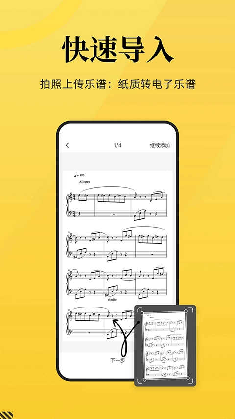 纸谱一拍即得(自动框选、自动调整方向并进行变形校正),轻松解决乐谱绘制中的疑难杂症。还能一键去噪、去除阴影,优化色彩与亮度。支持全格式乐谱(jpg、png、pdf等),全终端(手机相册、手机文件、平板文件、电脑文件等)均可一键导入。