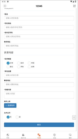 2、进入界面,填入市民资料,选取求助类型,输入主题内容等信息,随后点击提交即可。