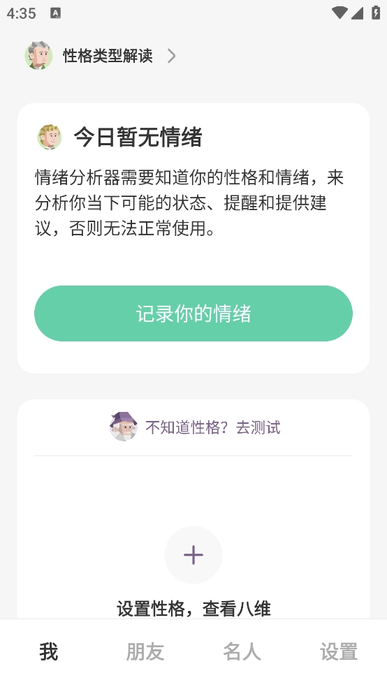 用户在主界面能够进行情绪状态的记录,同时也可以开展性格测试与相关解析工作。