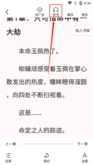 进入阅读界面后,轻触屏幕调出功能栏,随后选择功能栏顶部的听书功能即可。