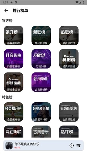 用户选择的音乐榜单,点击进入后会呈现丰富的曲目资源,可通过上下滑动的方式进行浏览。