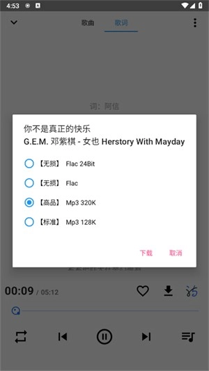 发现心仪的音乐后,点击进入播放界面,能自由挑选音质模式,既可以在线试听片段,也能完整收听整首曲子。