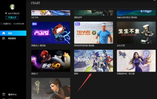 启动电脑里的腾讯START云游戏应用,进入主界面后完成账号登录操作。登录完成后,在界面右侧的游戏列表区域找到《原神》这款游戏,点击即可进入游戏页面。