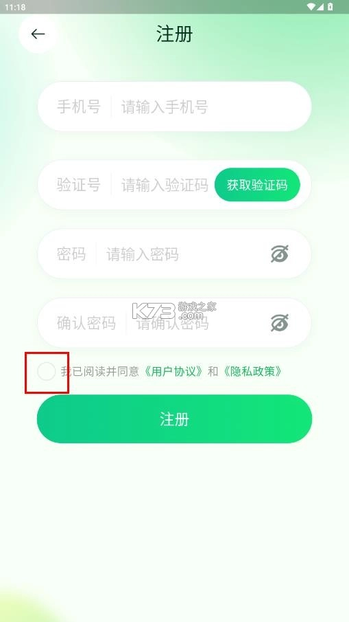 输入手机号码、验证码、密码、确认密码;